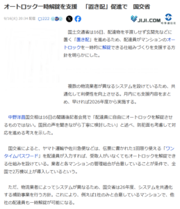 ニュースを読んで驚きました。国が「置き配」拡大のために、配達員がマンションのオートロックを解錠できる仕組みの開発に補助金を出すというのです。物流効率化を推進する狙いは理解できますが、ここで改めて問いたいのは――本当に必要な補助金なのか?という点です。